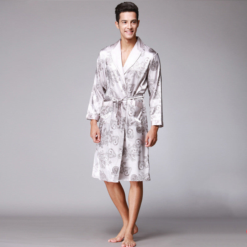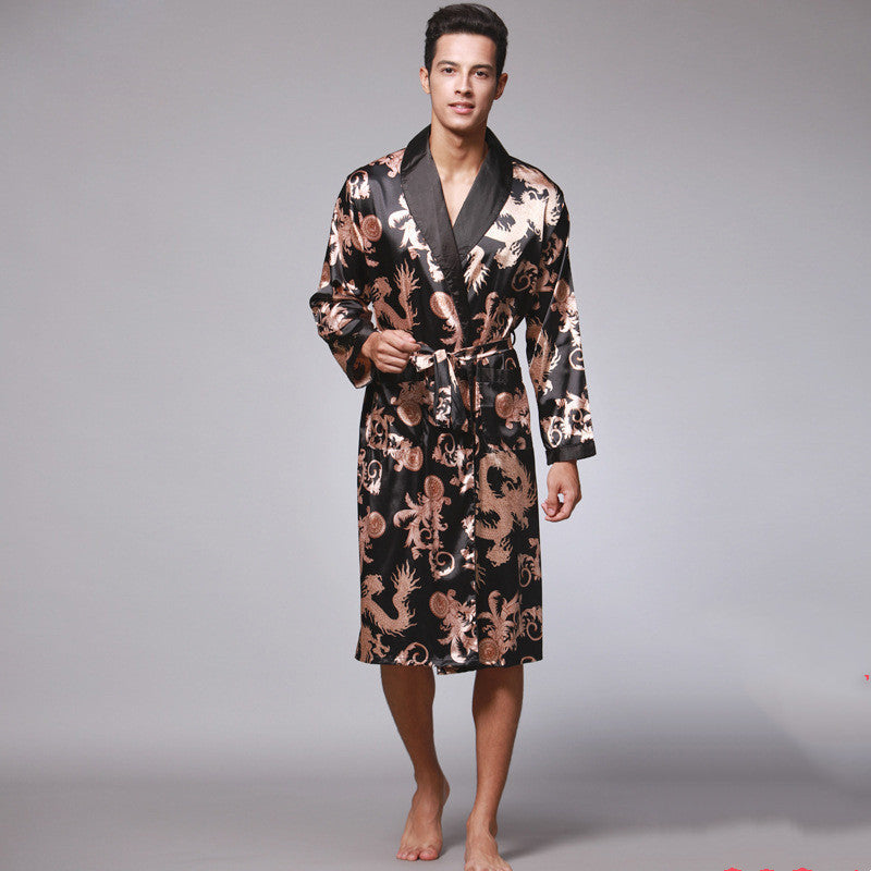 Long-Sleeved Nightgown, Printed Dragon Pattern, Long Bathrobe, Imitation Silk Home Service