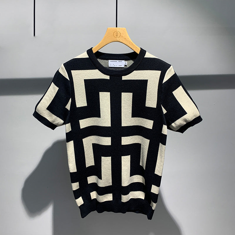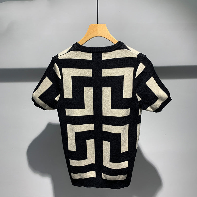 Men's New Fashion Versatile Geometric Jacquard Sweater Half Sleeve Round Neck