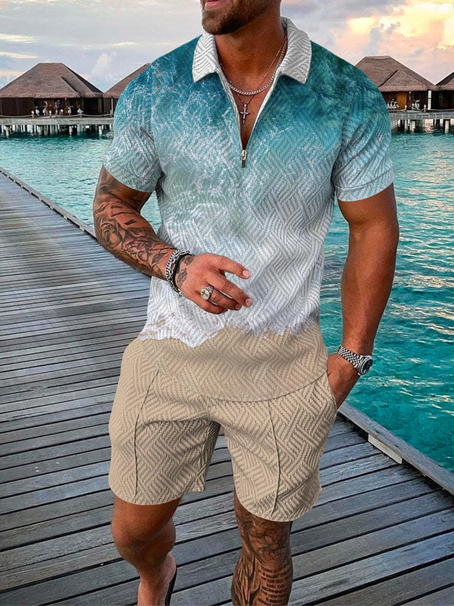 Men's Summer Fashion 3D Printed Short Sleeve Geometric Zip Lapel Shirt Set