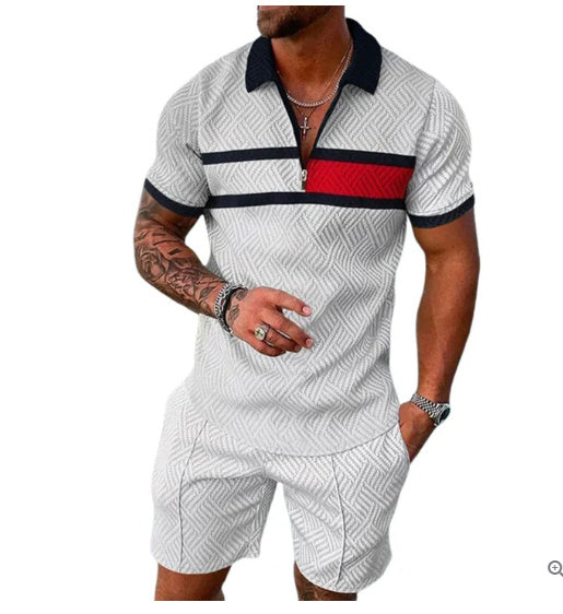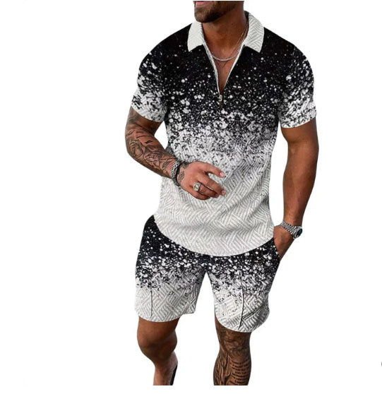 Men's Summer Fashion 3D Printed Short Sleeve Geometric Zip Lapel Shirt Set