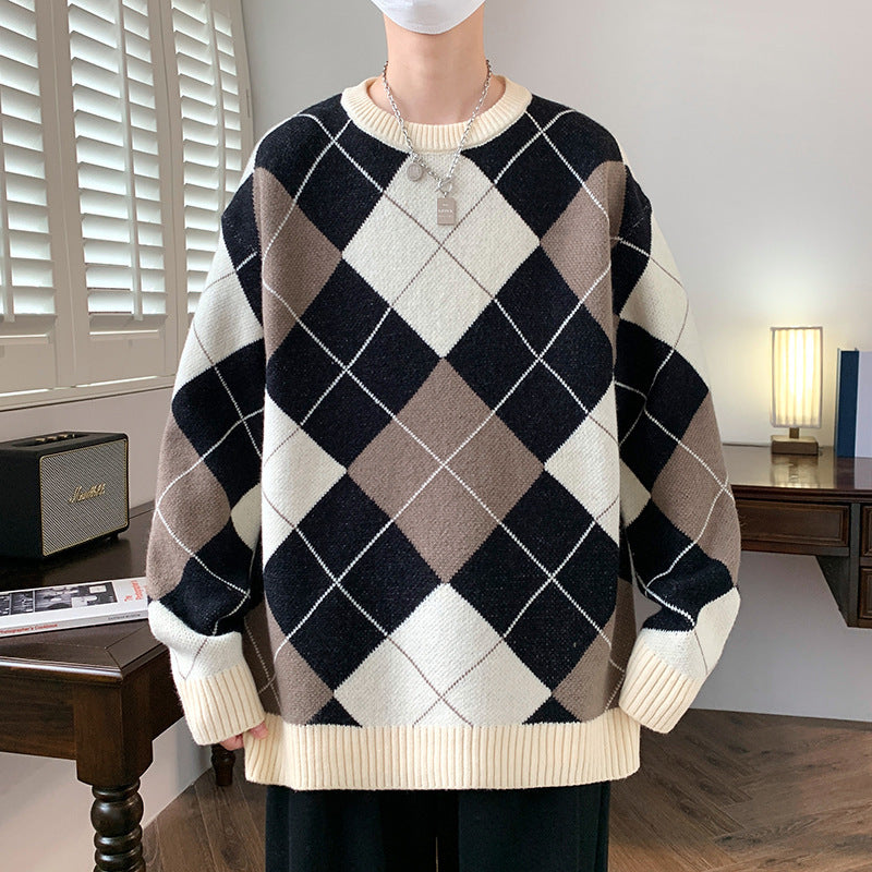 Rhombus Plaid Crew Neck Sweater Men's Autumn And Winter Thickened