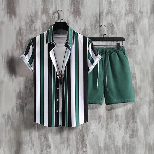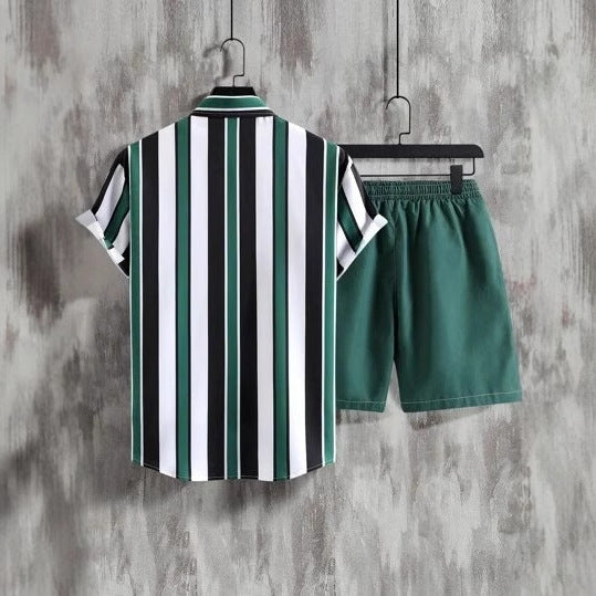 Striped Contrast Color 3D Printing Vacation Shirt Shorts 2 Pieces Suit