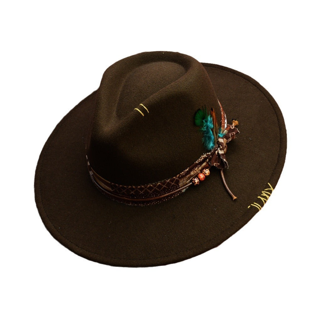 Western Original Design Manual Sewing Needle Woolen Felt Hat High-end And Fashionable Feather Model Fedora Hat